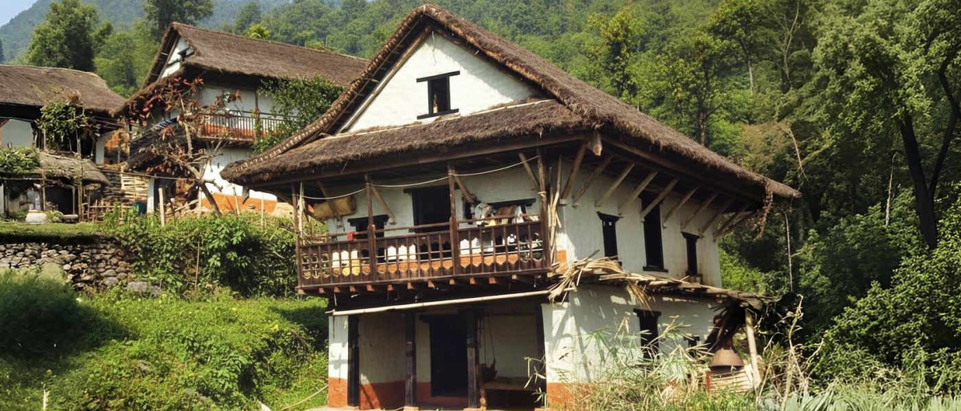 Indigenous architecture across the Himalayas exhibits striking variety depending on the community that created it. The climate, environment and geographic region are factors intimately tied to indigenous designs. The typical Limbu dwelling is a two-storey thatched house built from timber, bamboo, stone, mud and straw, which are all locally sourced items. Its steeply pitched roof and thick thatch are designed to avoid monsoon rain and withstand winter snowfall, and the mud walls effectively regulate temperature and provide durability. Designed with careful attention to natural features, such as rivers and slopes, a traditional Limbu house demonstrates both practical concerns and spiritual beliefs.